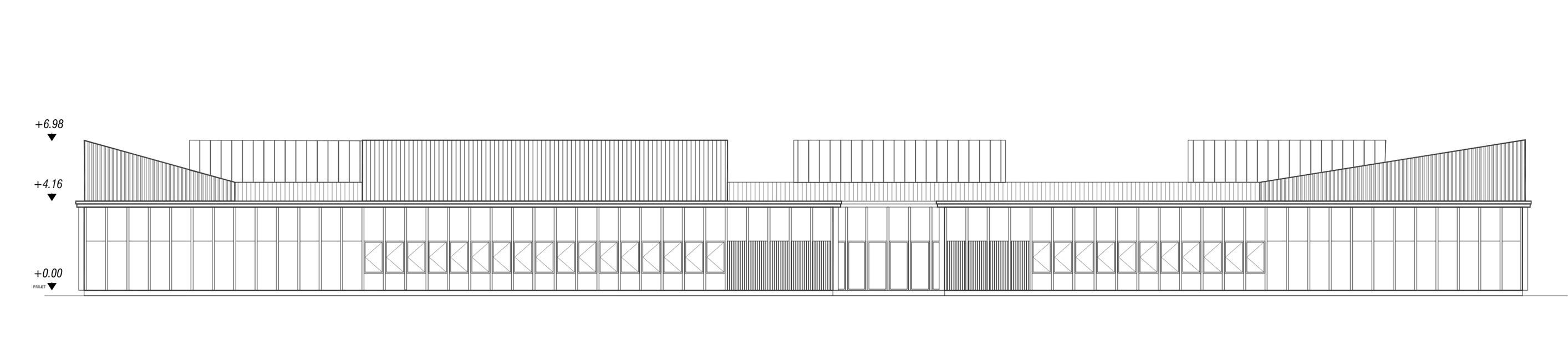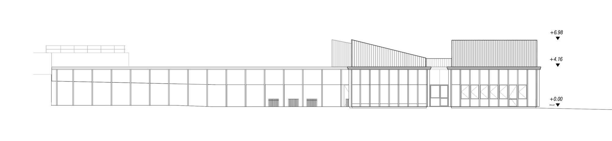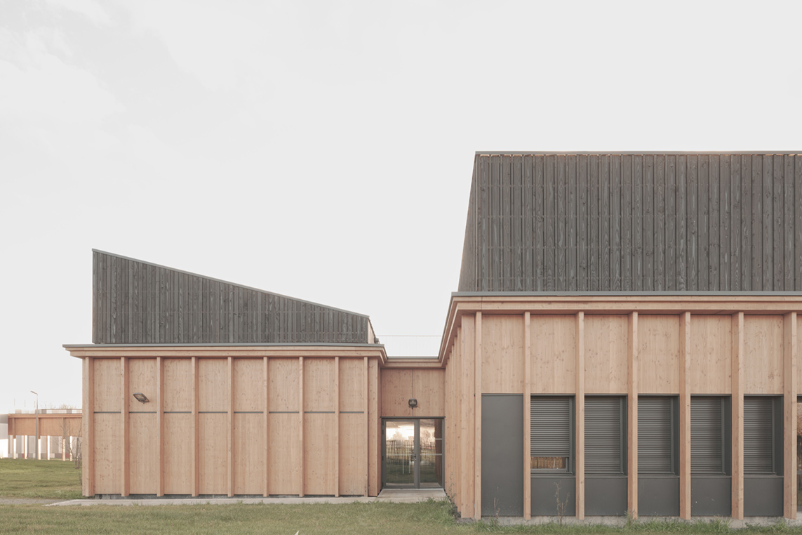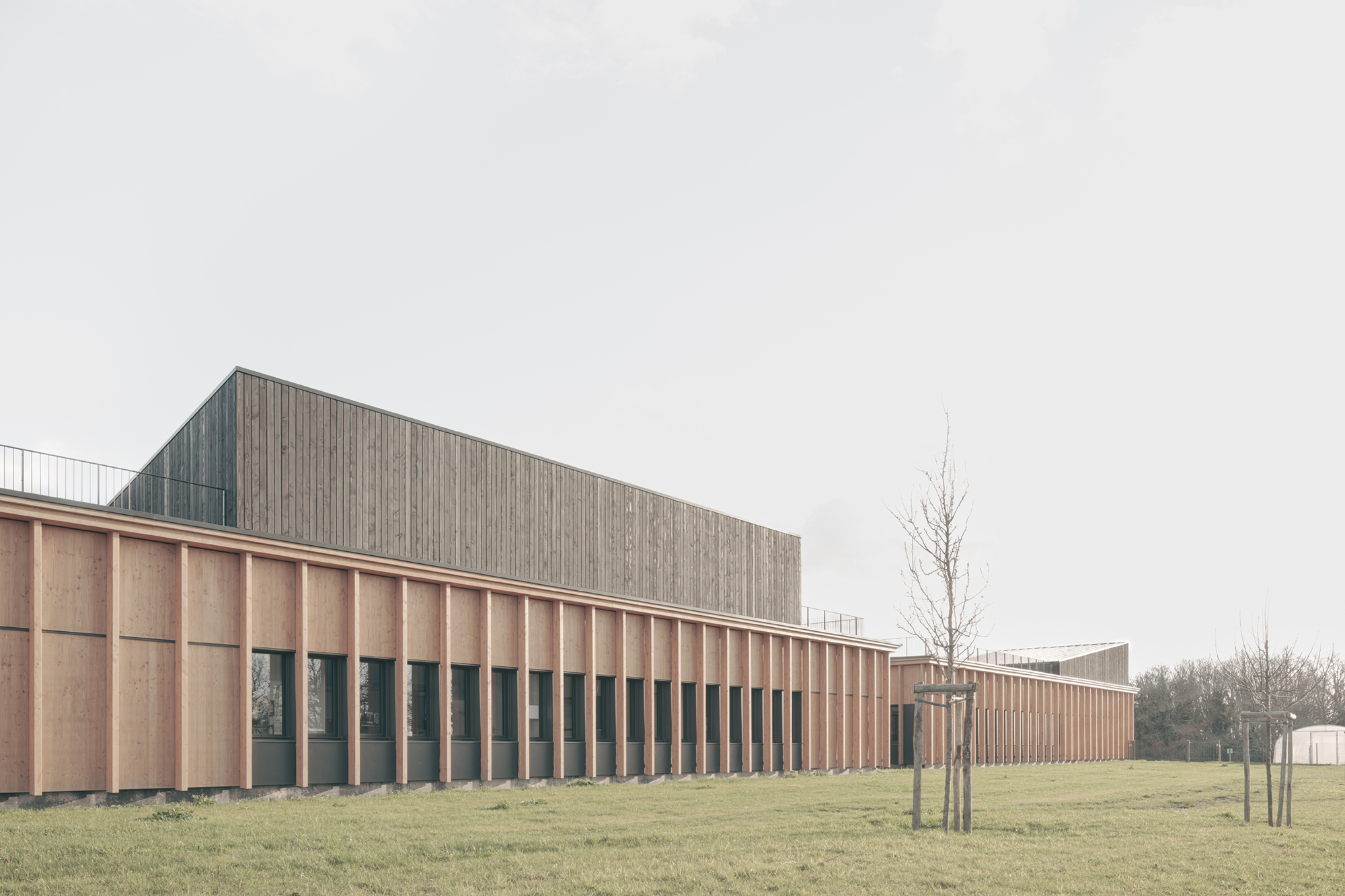 Le projet d’extensions du collĂšge actuel nait d’un besoin croissant en espaces d’enseignement, notamment Ă  destination de la section d’enseignement gĂ©nĂ©ral et professionnel adaptĂ© (SEGPA). Cette section est dĂ©diĂ©e aux Ă©lĂšves prĂ©sentant des difficultĂ©s scolaires importantes. Une rĂ©serve fonciĂšre Ă  l’Ouest de la construction rĂ©cente est prĂ©vue pour accueillir le projet, en lisiĂšre d’un bois. Issu d’une architecture d’échelle domestique et fonctionnelle, le projet puise sa force dans des rĂ©fĂ©rences locales. La morphologie s’inspire des compositions de village vernaculaire : celles aux formes agglomĂ©rĂ©es et aux jeux de toitures variĂ©es. La gĂ©nĂ©rositĂ© des volumes est mise Ă  profit des espaces d’ateliers et invite ses utilisateurs Ă  dĂ©couvrir une nouvelle maniĂšre d’apprendre par le biais de la mise en pratique. Dans une logique de valorisation des mĂ©tiers artisanaux, la structure est entiĂšrement rĂ©alisĂ©e en bois français. Le bardage des parties courantes est en panneaux 3 plis de douglas. Les volumes hauts sont bardĂ©s en lames de bois avec saturateur noir. Un systĂšme de rĂ©cupĂ©ration des eaux pluviales est prĂ©vu pour alimenter le systĂšme d’arrosage de la serre et de l’aire d’application extĂ©rieure. L’éclairage naturel de tous les espaces permet d’optimiser les dĂ©penses Ă©nergĂ©tiques. L’ensemble de ces choix permettent d’atteindre un niveau Ă©quivalent E3C1. D’une part, l’extension Ouest joue le rĂŽle de vitrine de la production et du savoir faire de la Section d’Enseignement GĂ©nĂ©ral et Professionnel AdaptĂ© (SEGPA) et participe Ă  une meilleure intĂ©gration de ses Ă©lĂšves au sein du collĂšge. LiĂ©e au collĂšge existant par une galerie couverte (forum et hall), elle est traversĂ©e par une circulation unique distribuant le pĂŽles Espace Rural et environnement (ERE) ouvert au Sud sur des parcelles potagĂšres et un verger, et le pĂŽle HygiĂšne Alimentation Services (HAS) avec cuisine et espace couture, repassage. D’autre part, l’extension Est s’aligne respectueusement sur les façades et les lignes directrices du collĂšge existant et achĂšve le dispositif architectural.