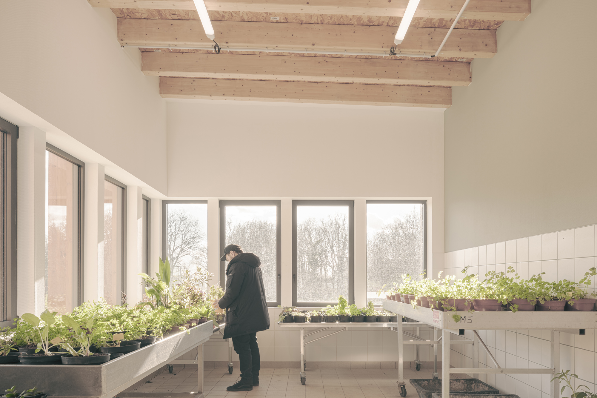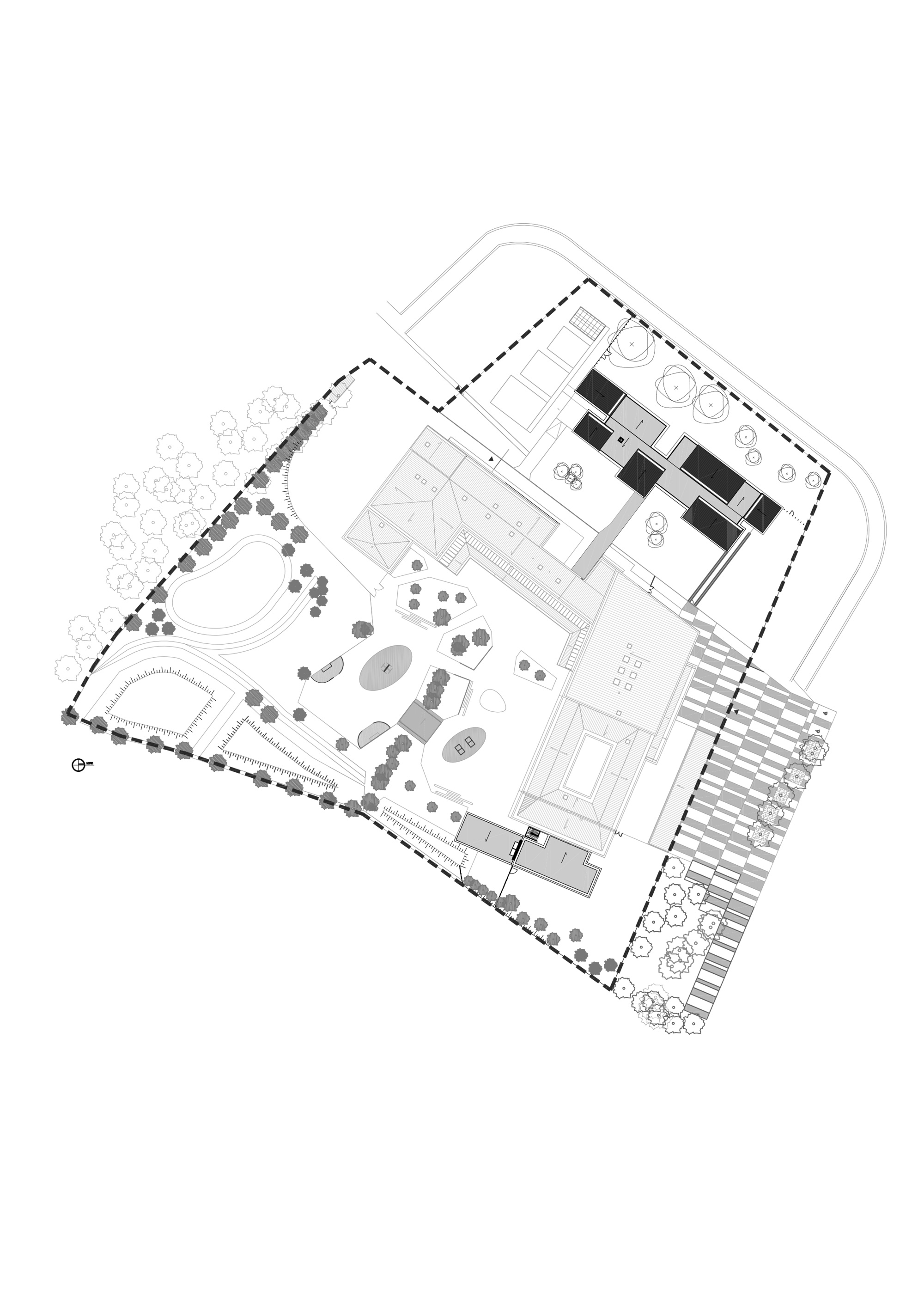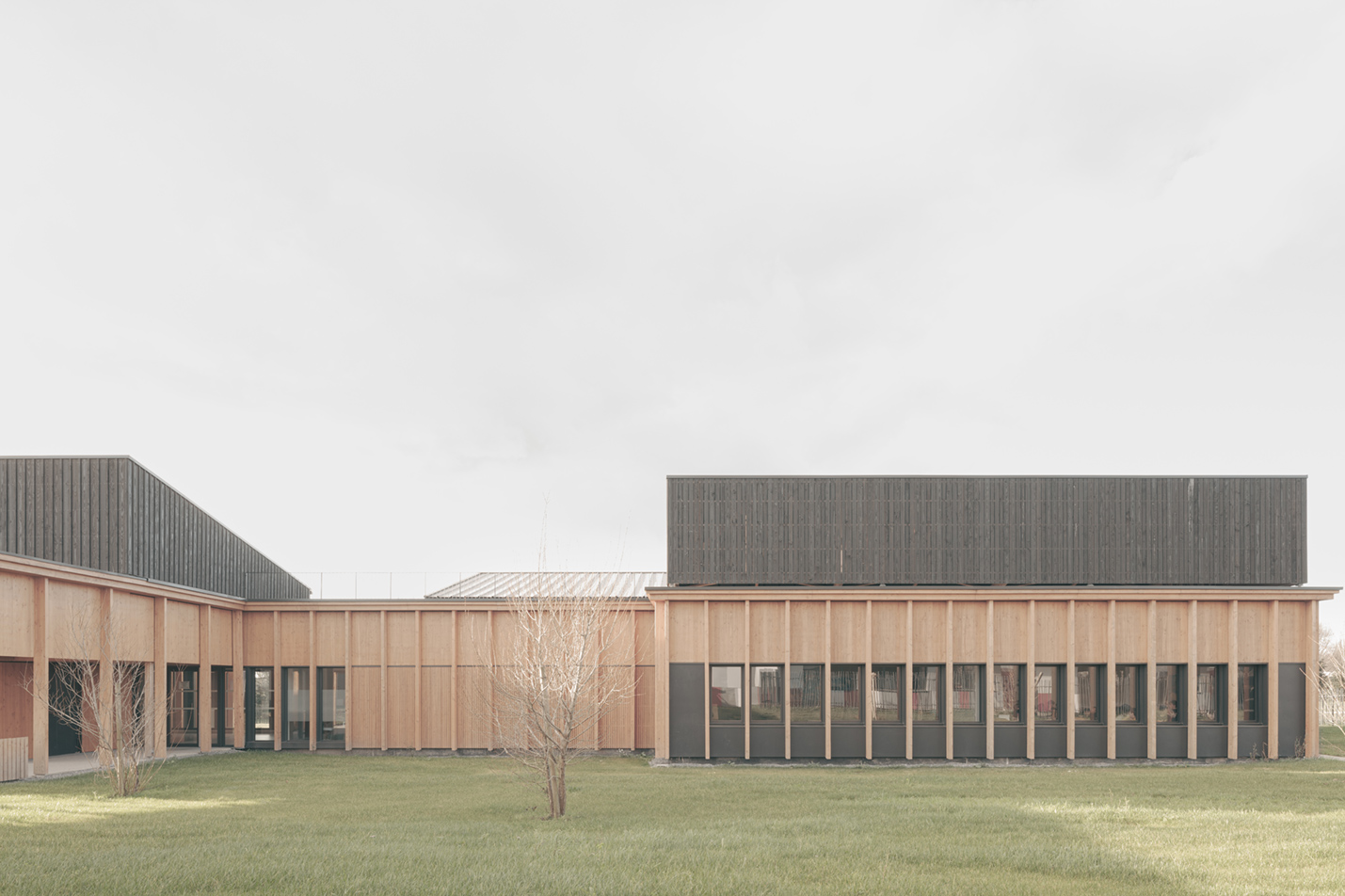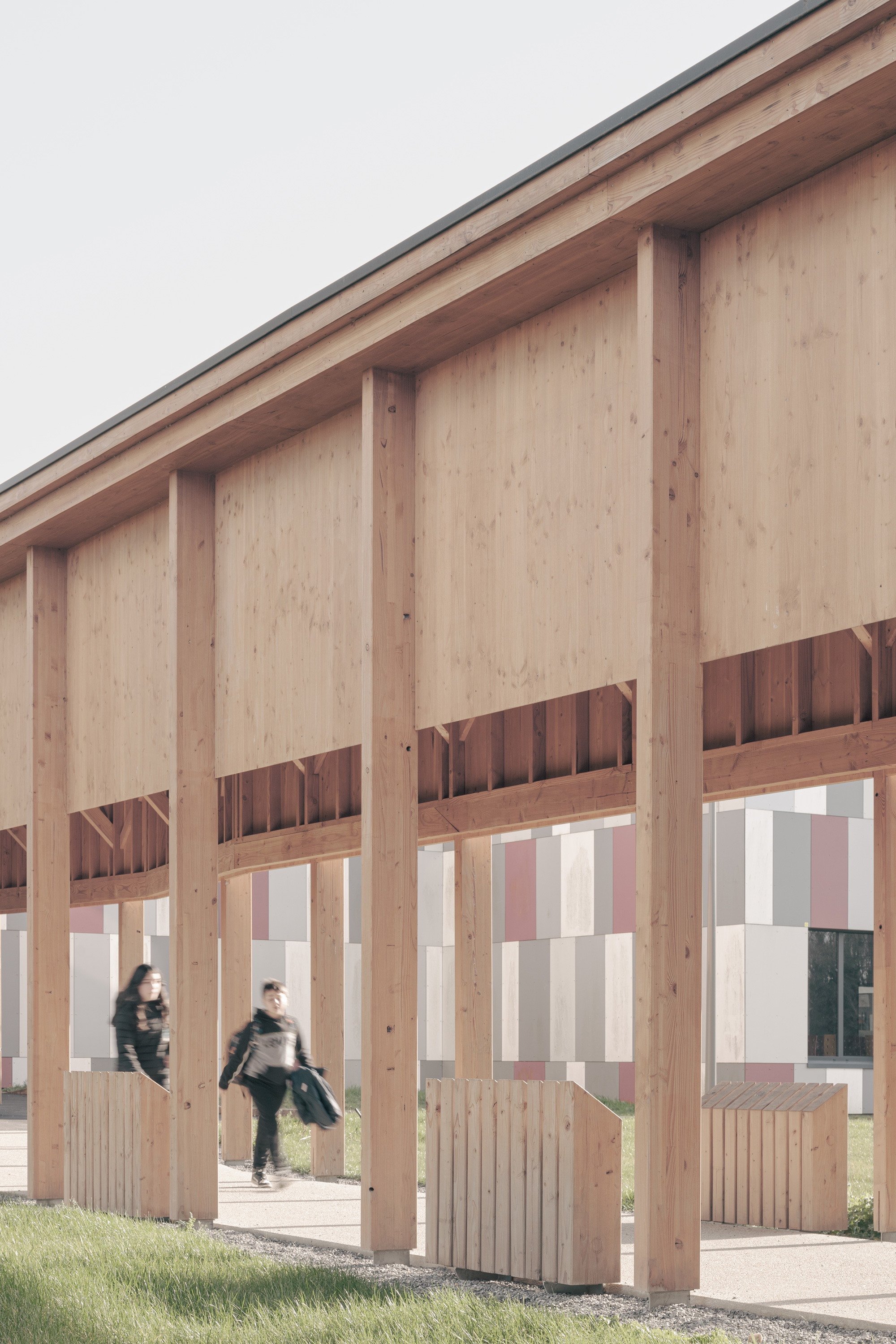 Le projet d’extensions du collĂšge actuel nait d’un besoin croissant en espaces d’enseignement, notamment Ă  destination de la section d’enseignement gĂ©nĂ©ral et professionnel adaptĂ© (SEGPA). Cette section est dĂ©diĂ©e aux Ă©lĂšves prĂ©sentant des difficultĂ©s scolaires importantes. Une rĂ©serve fonciĂšre Ă  l’Ouest de la construction rĂ©cente est prĂ©vue pour accueillir le projet, en lisiĂšre d’un bois. Issu d’une architecture d’échelle domestique et fonctionnelle, le projet puise sa force dans des rĂ©fĂ©rences locales. La morphologie s’inspire des compositions de village vernaculaire : celles aux formes agglomĂ©rĂ©es et aux jeux de toitures variĂ©es. La gĂ©nĂ©rositĂ© des volumes est mise Ă  profit des espaces d’ateliers et invite ses utilisateurs Ă  dĂ©couvrir une nouvelle maniĂšre d’apprendre par le biais de la mise en pratique. Dans une logique de valorisation des mĂ©tiers artisanaux, la structure est entiĂšrement rĂ©alisĂ©e en bois français. Le bardage des parties courantes est en panneaux 3 plis de douglas. Les volumes hauts sont bardĂ©s en lames de bois avec saturateur noir. Un systĂšme de rĂ©cupĂ©ration des eaux pluviales est prĂ©vu pour alimenter le systĂšme d’arrosage de la serre et de l’aire d’application extĂ©rieure. L’éclairage naturel de tous les espaces permet d’optimiser les dĂ©penses Ă©nergĂ©tiques. L’ensemble de ces choix permettent d’atteindre un niveau Ă©quivalent E3C1. D’une part, l’extension Ouest joue le rĂŽle de vitrine de la production et du savoir faire de la Section d’Enseignement GĂ©nĂ©ral et Professionnel AdaptĂ© (SEGPA) et participe Ă  une meilleure intĂ©gration de ses Ă©lĂšves au sein du collĂšge. LiĂ©e au collĂšge existant par une galerie couverte (forum et hall), elle est traversĂ©e par une circulation unique distribuant le pĂŽles Espace Rural et environnement (ERE) ouvert au Sud sur des parcelles potagĂšres et un verger, et le pĂŽle HygiĂšne Alimentation Services (HAS) avec cuisine et espace couture, repassage. D’autre part, l’extension Est s’aligne respectueusement sur les façades et les lignes directrices du collĂšge existant et achĂšve le dispositif architectural.