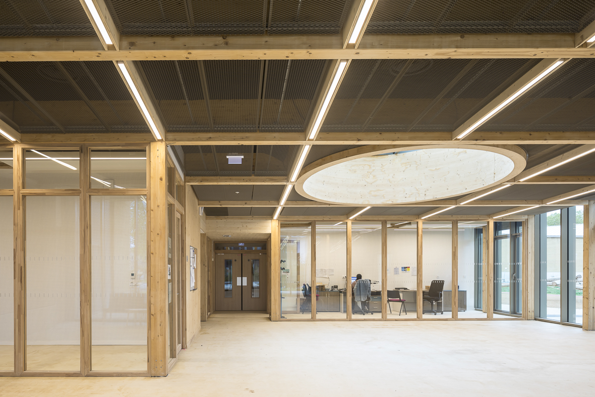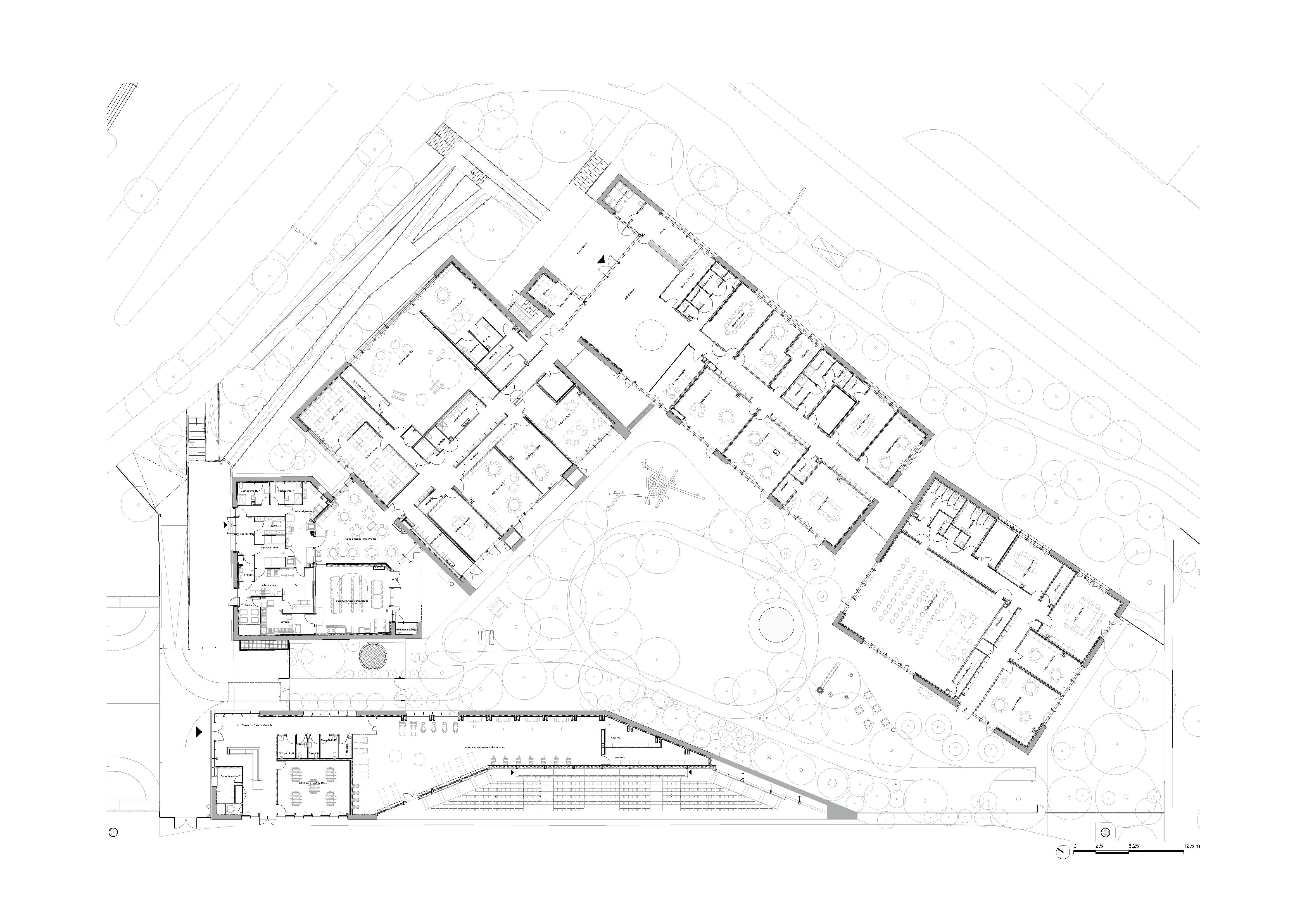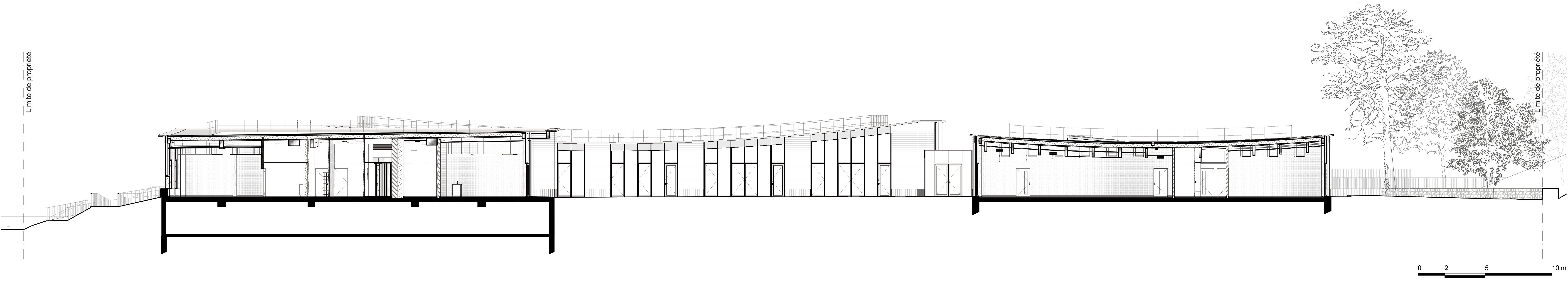 Fondée en 2018 par Charles Hesters et Pierre Martin-Saint-Etienne, l’agence HEMAA revendique une architecture contextuelle, sobre et ancrée dans le vivant. Chaque projet naît d’une lecture attentive du territoire, dans une quête d’équilibre entre nature, usages et matière. À Évry-Courcouronnes, le pôle enfance et sportif du Parc des Loges incarne pleinement cette démarche : une composition pavillonnaire douce et paysagère, construite en matériaux bio-sourcés et géo-sourcés, au service d’un équipement public ouvert, généreux et durable. Une architecture enracinée Implanté avec justesse dans la topographie, le projet épouse la pente naturelle sans artificialisation. Cinq entités – maternelle, élémentaire, relais d’assistantes maternelles, restauration et tribune sportive – s’organisent autour d’une cour-jardin centrale, protégée de la rue et ouverte sur le paysage. Reliés par de fines passerelles vitrées, ces volumes autonomes favorisent la lumière naturelle, les vues croisées et le lien au vivant. Allégorie des matériaux constitutifs du parc des loges, les façades sont en pisé porteur et la charpente intérieure entièrement en bois. Des cheminements serpentent entre les arbres nouvellement plantés, prolongeant naturellement l’école dans le parc. Le jardin d’enfants devient une forêt apprivoisée, plantée de chênes, frênes, érables et ormes et ponctuée d’une clairière propice aux jeux libres. Inspiré des principes du Waldkindergarten, le projet offre ainsi une vision ludique et immersive de l’apprentissage, ancrée dans la nature et le vivant. Matières sobres L’ensemble s’inscrit dans une démarche environnementale exigeante. Les 665 m³ de terre porteuse utilisés pour les façades — soit 1 330 m² d’un mur de 50 cm d’épaisseur — proviennent des déblais des tunnels du métro du Grand Paris. Isolées par de la laine de chanvre, ces parois conservent la capacité perspirante propre au pisé. Les toitures végétalisées en berceaux (15 à 20 cm de substrat) renforcent le confort thermique et la gestion naturelle des eaux. Des brise-soleils orientables et de profonds débords de toiture régulent naturellement l’ensoleillement. L’orientation des volumes capte la lumière d’hiver et favorise la ventilation naturelle estivale. Une végétation abondante et diversifiée limite les effets d’îlot de chaleur et renforce la biodiversité. Le bois et le pisé dessinent une architecture douce et enracinée aux formes géométriques simples. Dans cette commune populaire, une part importante des enfants ne quittent pas leur ville pendant les périodes de vacances. Le pôle d’enfance doit être un lieu d’apprentissage et d’évasion. Le pisé, matière vivante et respirante, invite au toucher et offre un cadre inédit aux enfants de cette ville nouvelle, entièrement construite en béton. Le bois, chaleureux et tactile, habille l’intérieur et la charpente. En soubassement, un béton bas carbone matricé, ponctué d’allèges vitrées à 60 cm, conjugue robustesse, lumière et intimité pour les plus petits. Un équipement partagé Le pôle sportif prolonge naturellement cette écriture architecturale. Sa tribune de 300 places, parfaitement orientée, offre un confort visuel optimal. Sa toiture à pente douce s’abaisse du côté du pôle de loisirs, préservant la lumière et les vues dans les cours. Intégré à l’ensemble, il renforce l’idée d’un lieu partagé, intergénérationnel et ouvert sur la ville.